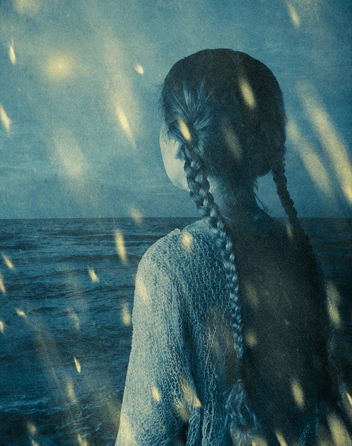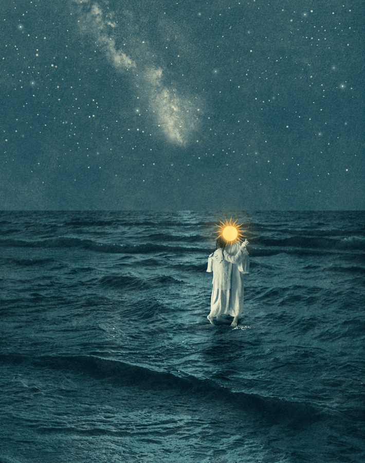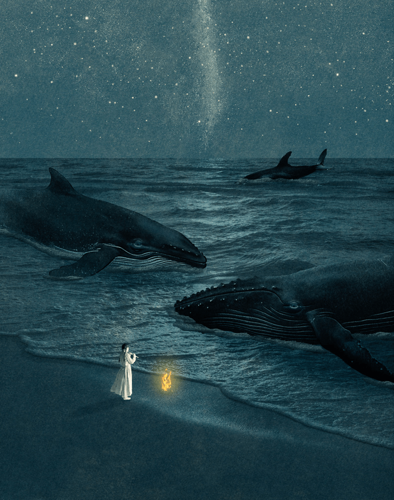 Wielkie morskie stworzenia przywabione harmonią dźwięków, na ciemnych falach zmierzają ku brzegowi z otchłani dzikich i bezdennych. Ich potężne ciała, wybudzone z pradawnego snu, nasączone wonnością bezdennych głębin, lśnią od spływającej po grzbietach wody. Stłoczone przy lądzie oddychają ciężko. W zamyśleniu uważnie wsłuchują się w pieśń, którą noc sędziwa, przyjmuje pod swój płaszcz.