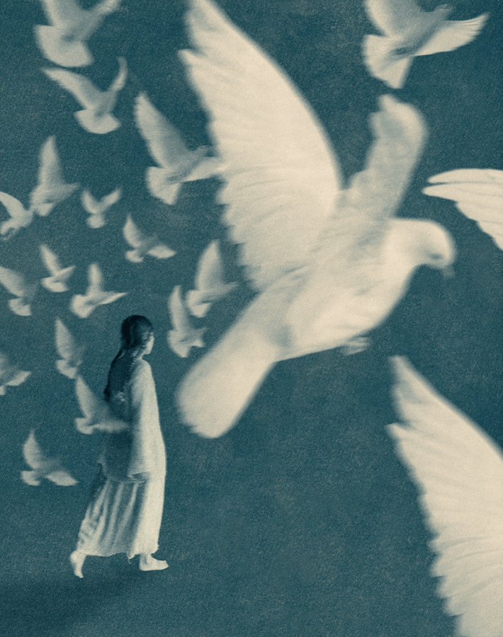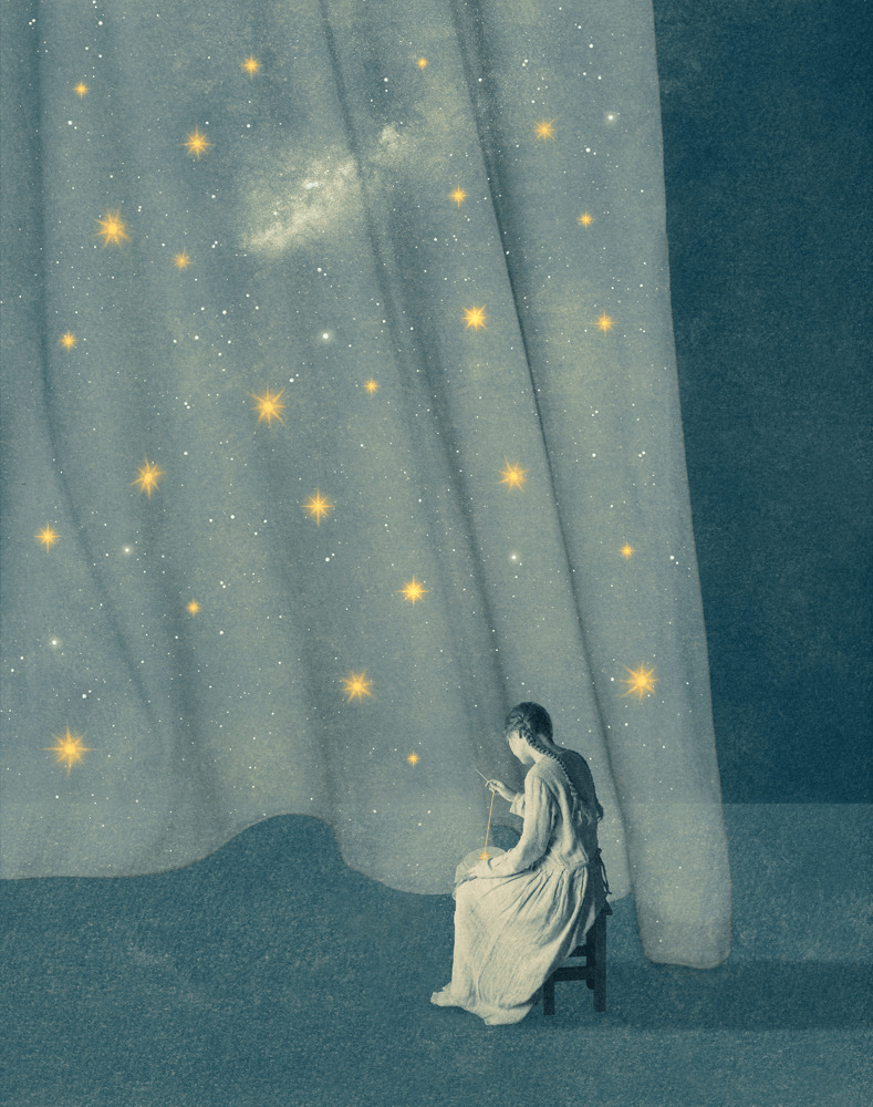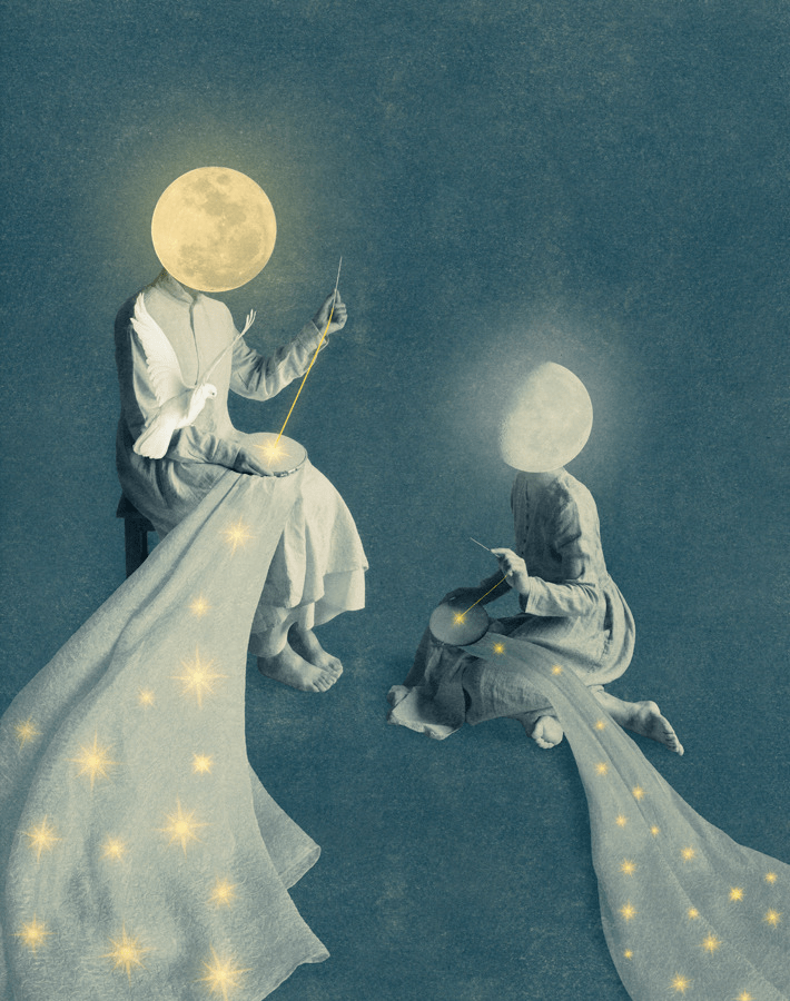 Pomiędzy nimi, wysoko w górze, przez mgłę, dostrzegam kontur kobiecej sylwetki. Pochylona nad materiałem w skupieniu haftuje wzory, czuwając bez znużenia. Jej dłonie, poruszane w myśl Boskiego zamysłu, złotymi nićmi łączą to, co pozornie odległe. Starannie wygładzają wykrzywione miejsca, nadają jasność punktom orientacyjnym, najczulszym ruchem zacerowują rozdarcia. Na szacie dostrzegam niezliczone wątki jakiejś ludzkiej historii, które szczodrze obszywa szlachetnymi nićmi, przydając im blasku. Z podziwem obserwuję niestrudzoną pracę kobiety. I gdy trwam w zamyśleniu, ona odrywa wzrok od igły. Spogląda w moją stronę i dostrzega, że patrzę na nią. Na jej twarzy pojawia się uśmiech.