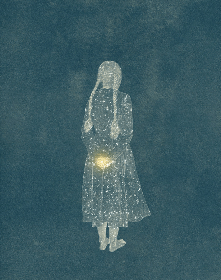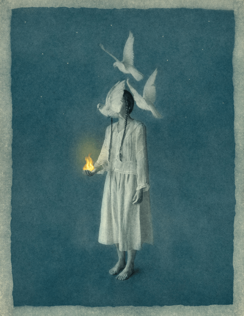 Mgła stopniowo gęstnieje, kształty zachodzą światłem i obraz kobiety powoli niknie w bieli. Patrzę teraz przed siebie, w skrzące ognisko, które płonie między mną a moją gwiezdną towarzyszką. Przez długi czas nie mówię nic. Nie dlatego, że brak mi słów — ale dlatego, że pierwszy raz od bardzo dawna nie czuję potrzeby ich wypowiadania. Wszystko we mnie zostało ogarnięte światłością. Światłością, co nie oślepia, lecz rozświetla od środka. To nie światło zewnętrzne. To nie blask jakiegokolwiek stworzenia. To światło, które rozpoznaję jak echo. Jak coś, co zawsze było we mnie, a o czym zapomniałam.
