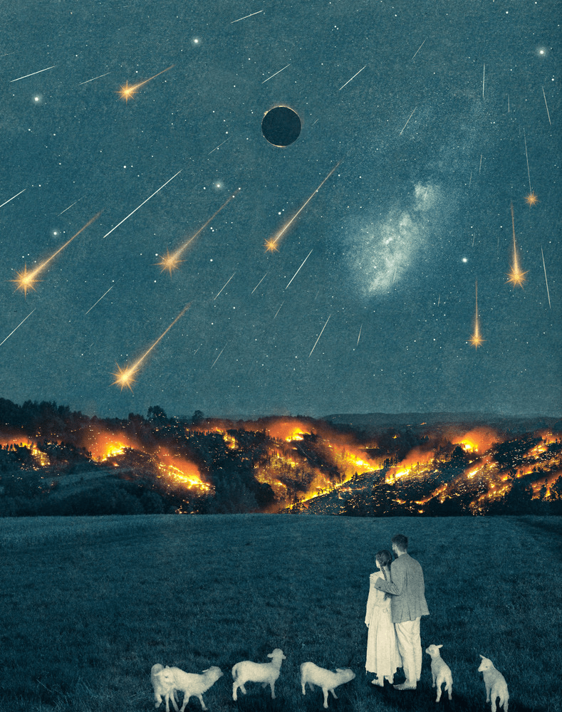 Zwierzęta, najpierw rozpierzchłe w popłochu, zaczęły wracać, jedno po drugim. Zbierały się razem, jakby chciały być blisko siebie i blisko człowieka. Kładliśmy na nich ręce, uspokajaliśmy drżące ciała owiec i bydła. Tej jednej nocy spłonęło wszystko. I my również. Trzymając się za ręce, obróciliśmy się na powrót w nie więcej niż łyżeczkę gwiezdnego pyłu.